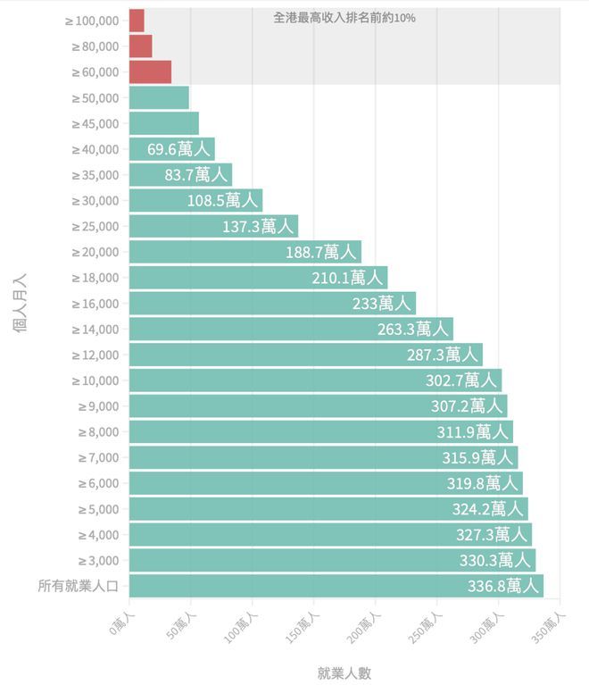 根据政府统计处《综合住户统计调查按季统计报告》,若不计及外佣,2023年第2季本港有3,802,400劳动人口,当中1,888,700是男性,女性有1,913,700,每月就业收入中位数是2万元,意味如果每月薪金多于2万元,已比全港一半打工仔高。