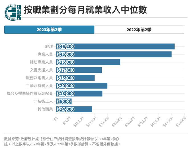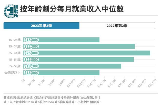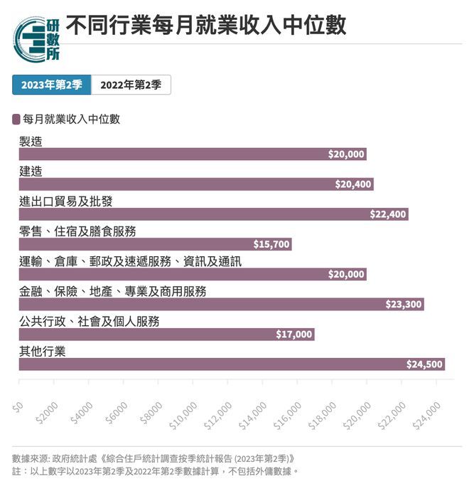 疫情后,打工仔薪酬有所改善,2023年第2季港人每月就业收入中位数20,000元,较2022年第2季的18,000元增加2,000元,当中男性每月就业收入中位数由20,500元升至22,200元,女性每月就业收入中位数由15,000元升至16,000元。